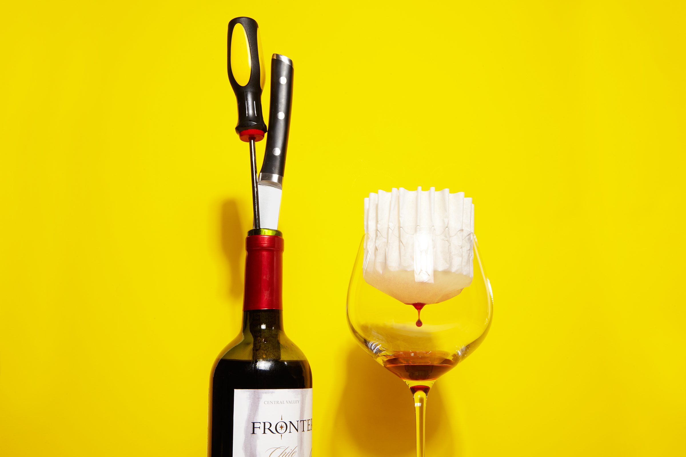If you, like so many others faced with a delicious bottle of wine but no corkscrew, are wondering how to open a wine bottle without a corkscrew, we have a few methods for you to try. First, put on your least-favorite shirt and step outside; with this method, there will be splash-back. The idea is to push the cork all the way into the bottle using the blunt tip of a screwdriver, butter knife, etc. Just stand your blunt instrument straight up atop the cork, and slowly hammer it in with the palm of your hand. You will see the cork starting to depress. Proceed very slowly from here. One mighty blow could send wine spurting up to your ceiling (as it did in our photo studio). Optional finale: Strain the wine through coffee filters like these to avoid getting cork in your pour.