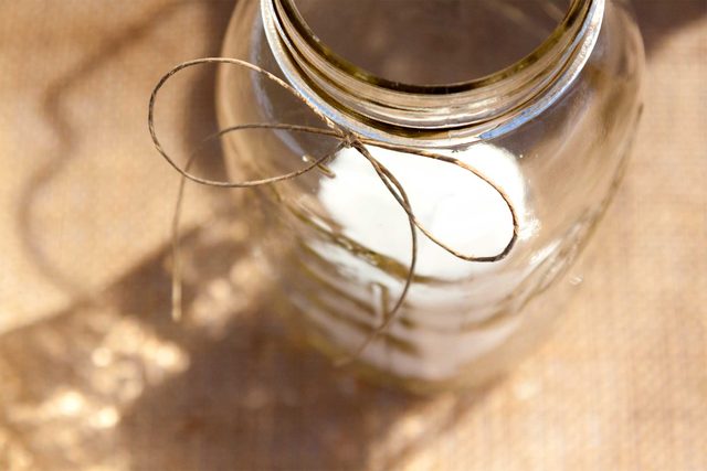 Repurpose old glass jars as candleholders by wrapping the top with metal wire and hanging them from tree branches. Use battery-operated candles instead of real ones—they create the same amount of light, but don’t leave behind any of that messy, hot wax.