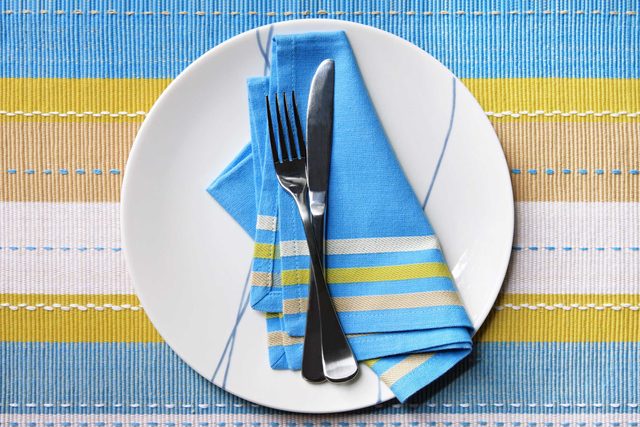 Boldly patterned napkins can make eye-catching placemats. Better yet, laying the napkins across the width of the table will cover enough space for two placemats instead of just one—a money saver as well as chic decor. Large, vibrant outdoor rugs also add flair without breaking the bank, and you can find them practically everywhere, from thrift shops to Target.