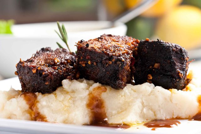 The fat will rise to the top, Wilmoth says, so if you don’t trim it off before cooking, you’ll end up with a greasy, oily pool of liquid or sauce at the end. That said, there is a balance: Fattier cuts of meat—such as short ribs or pork shoulders— actually do better in a slow cooker than leaner cuts, which dry out when cooked for longer periods of time, so while trimming the excess fat is important for maintaining a silky, rich flavor in your broth, you probably want to reach for fattier, inexpensive cuts of meat when you’re planning on using your Crock-Pot. If you do opt for a leaner cut of meat, make sure it stays submerged in whatever liquid (broth, water, wine) you cook it in. This will ensure it doesn’t dry out and stays juicy and tender.
