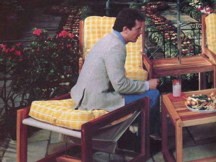 Redwood patio furniture seemed all the rage back in the ’80s and maybe even before that, too. Combine the redwood with the bright plaid cushions and this image screams “1980’s”.